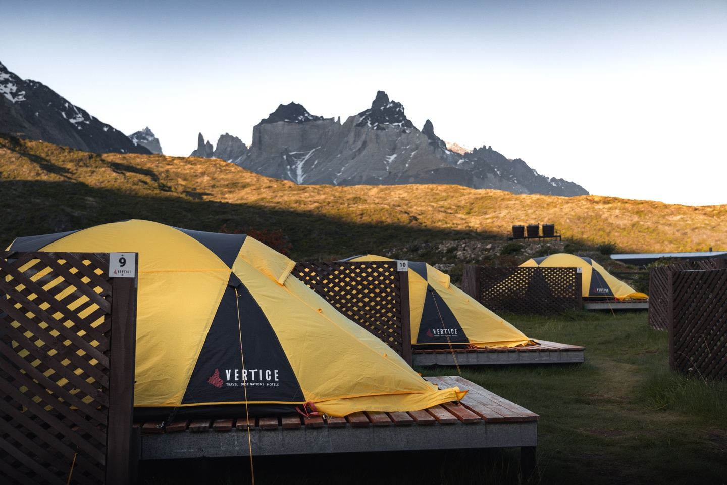 Junto al área de camping está nuestra terraza, donde puedes deleitarte con todo lo que ofrece nuestro Coffee Store con una hermosa vista del macizo Paine Grande.